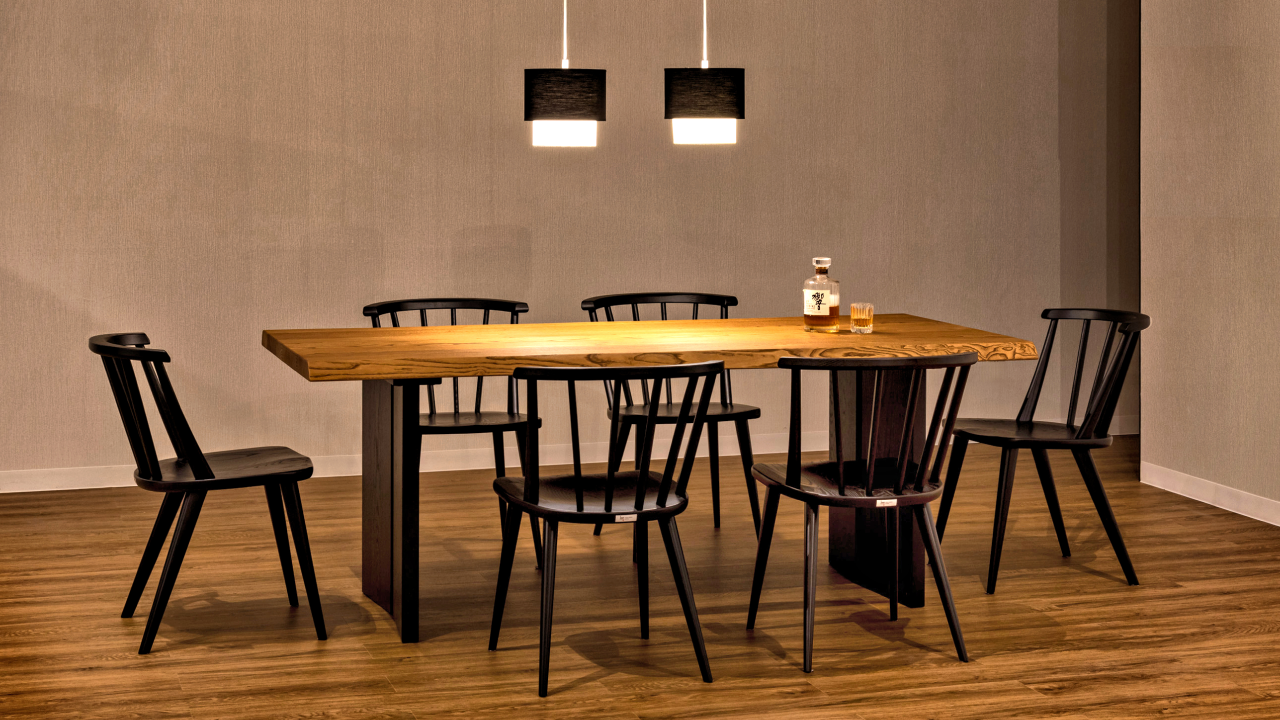 ダイナミックな栗の無垢天板、深みある木目とやさしい肌触りが、自分と向き合う時間、家族と集う時間を豊かに刻みます。シンプル、安定感ある座り心地のチェアが大切な時間の脇を固めます。真っ直ぐに座っても斜に座っても良いイスです。