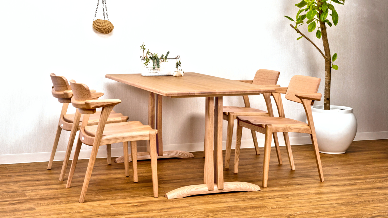 テーブルは、こだわりの天板R面取りに、脚さばき抜群で安定感ある脚の組み合わせ。
