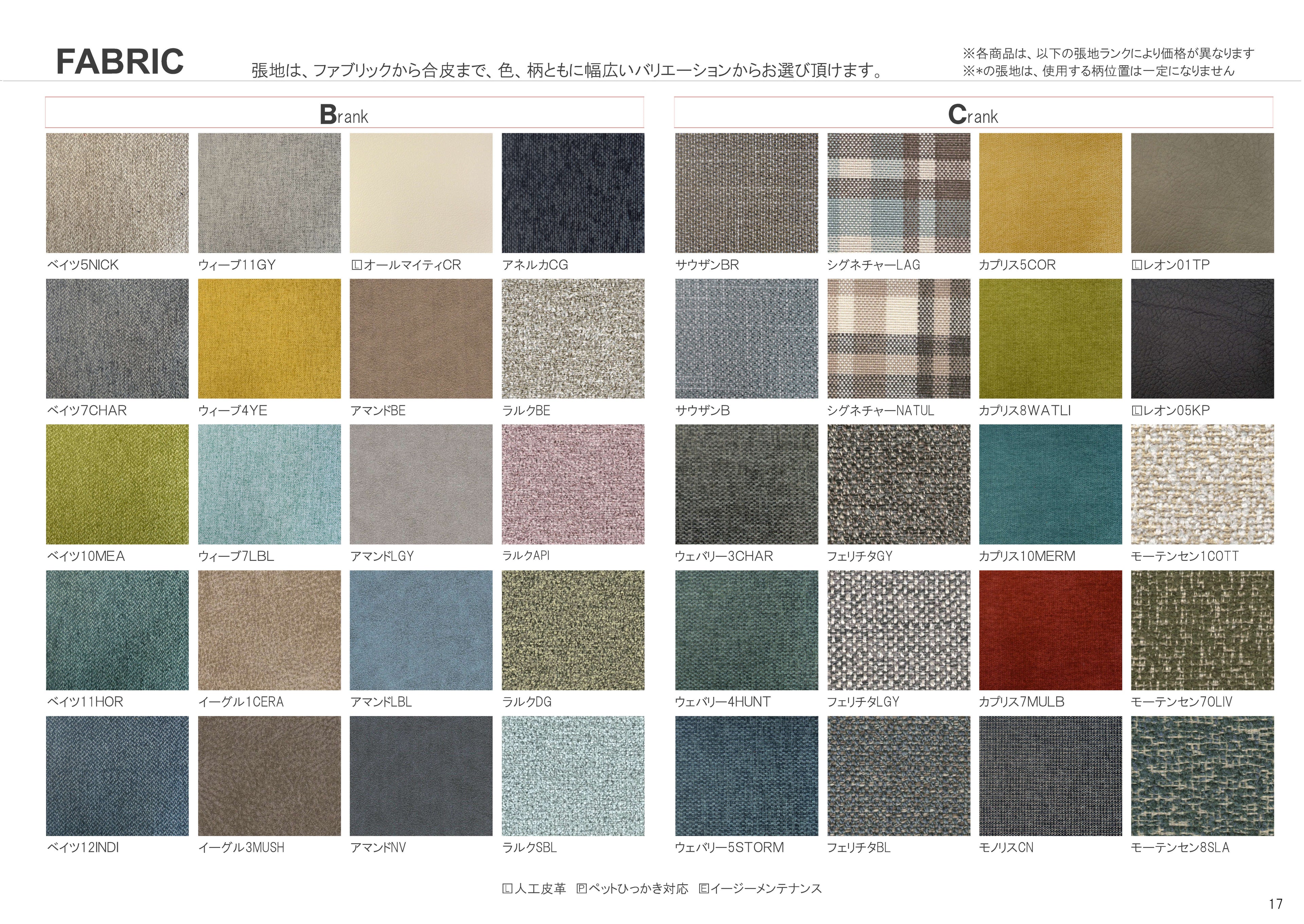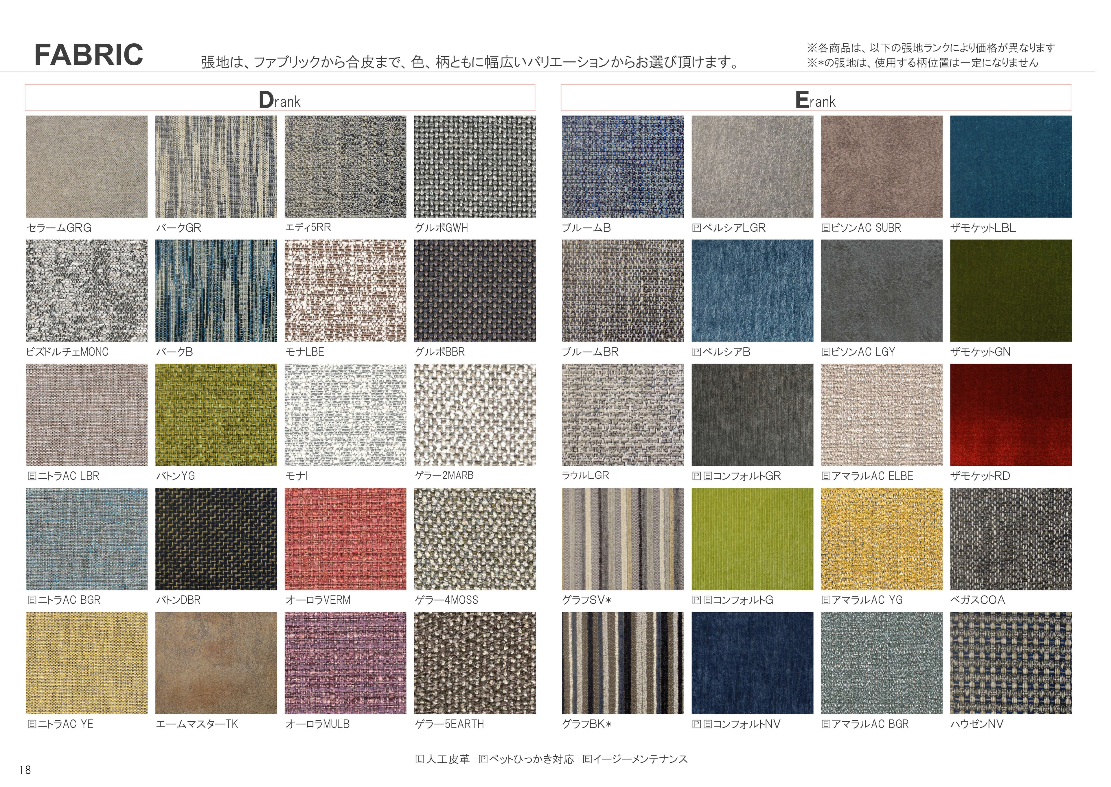 合わせる張地は数十種類あるので、お好みのデザインからお選びいただけます。ソファサイズは他に1Pと2Pもございます。